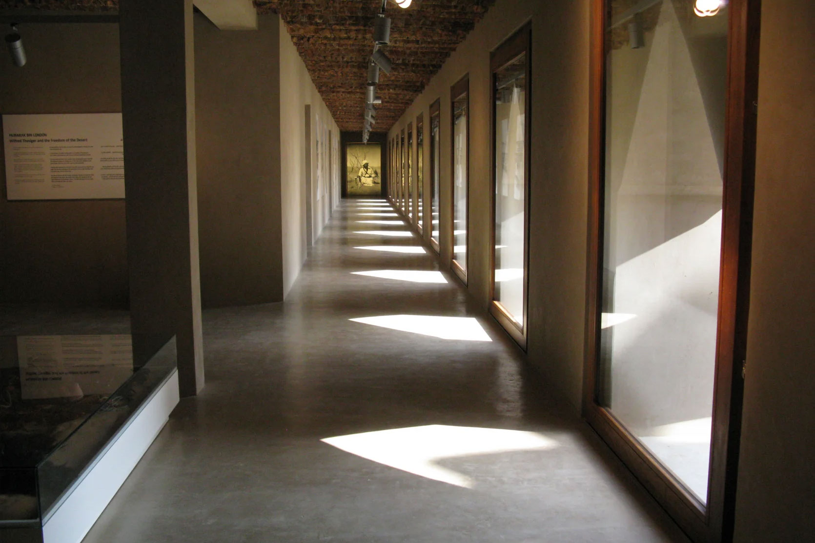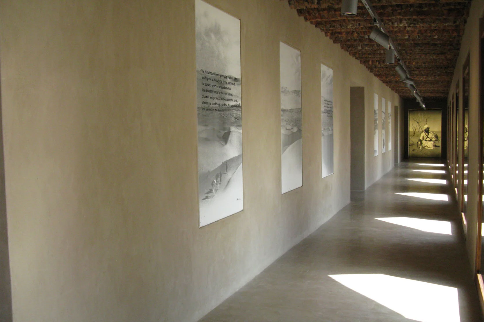Die Sanierung erfolgte komplett in historischen Lehm- und Palm-Materialien. Der Lehm wurde wiederaufbereitet und entsprechend der historischen Arbeitsweise handwerklich eingebaut. Als Oberflächenbeschichtung entschied man sich Lehmputz der Farbe kolumba-grau, der die Schwarzweißfotografien Thesigers ideal zur Geltung bringt. Bemerkenswert ist Lounge im Eingangsbereich. Ausgeführt wurden die Lehmbauarbeiten durch die Indische Lehmbaufirma Hunnarshala Foundation, die bei der Oberflächenbeschichtung von CLAYTEC Partner Wolfgang Scheeres und seinen Mitarbeitern angeleitet wurde. Das Gebäude wird durch eine kaltwasserbasierte oberflächennahe Bauteiltemperierung gekühlt. Dies und der Lehmputz erlauben es, die Lüftungsanteile auf den Frischluftbedarf minimiert zu reduzieren.