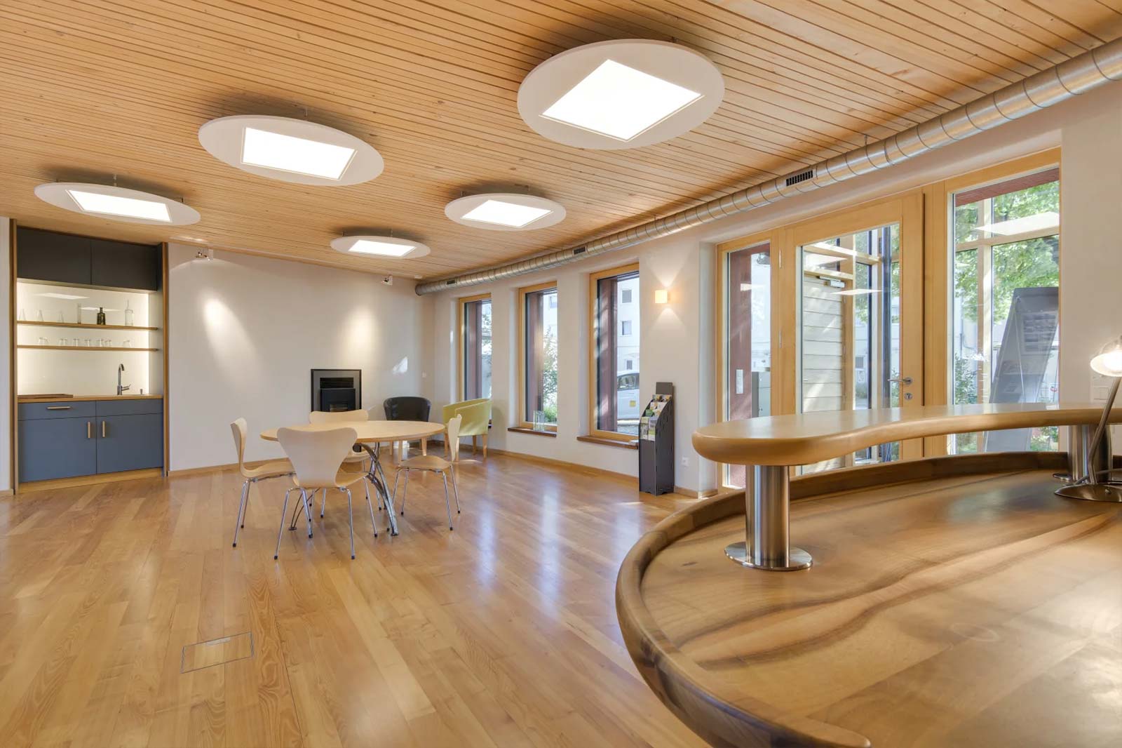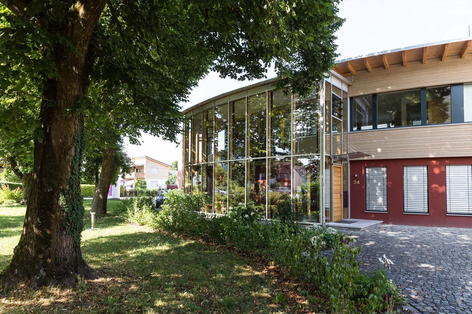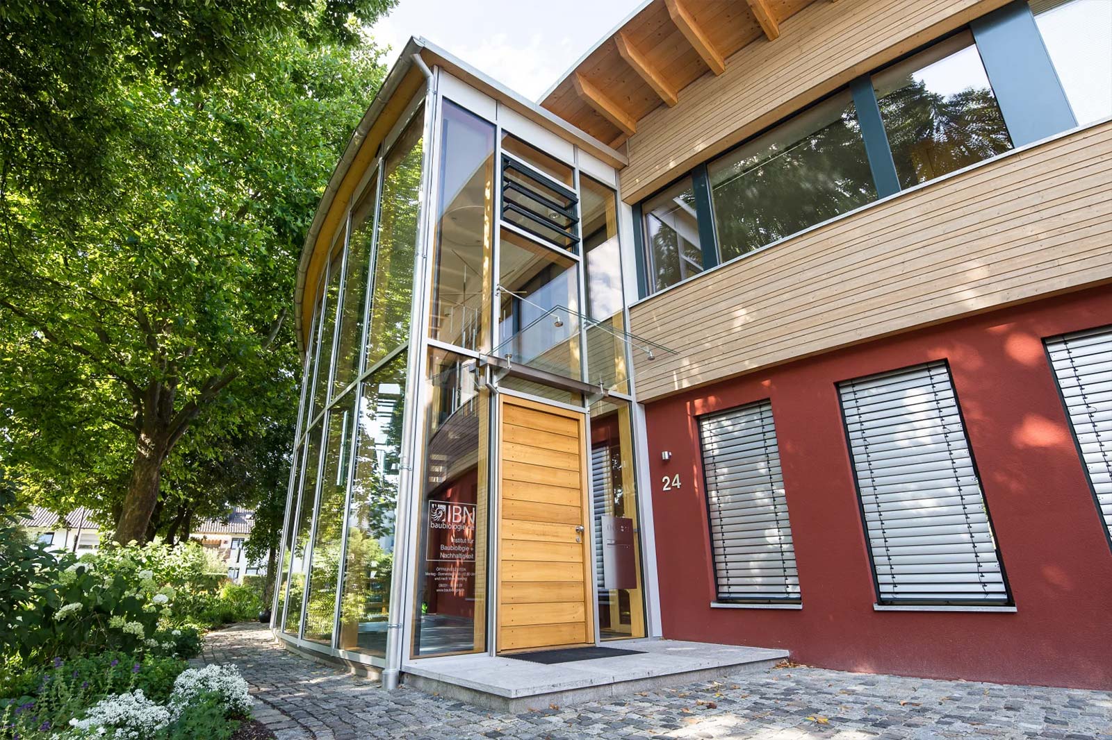 Sitz des Instituts für Baubiologie + Nachhaltigkeit (IBN) in Rosenheim. Ein vorhandener eingeschossiger, geschwungen-kreisförmiger Bau in Massivbauweise (ehemaliger Lebensmittelladen „Konsum“, Baujahr 1955) wurde umfassend saniert und durch ein Obergeschoss in Holzbauweise und ein verglastes Treppenhaus ergänzt. Dabei wurde besonderer Wert auf die Wiederbelebung des architektonischen Charmes der 1950er-Jahre gelegt. Ebenso auf die maßstäbliche Einbindung in die Umgebung, den Erhalt der großen Laubbäume und ein energiesparendes, nachhaltiges Gesamtkonzept.