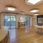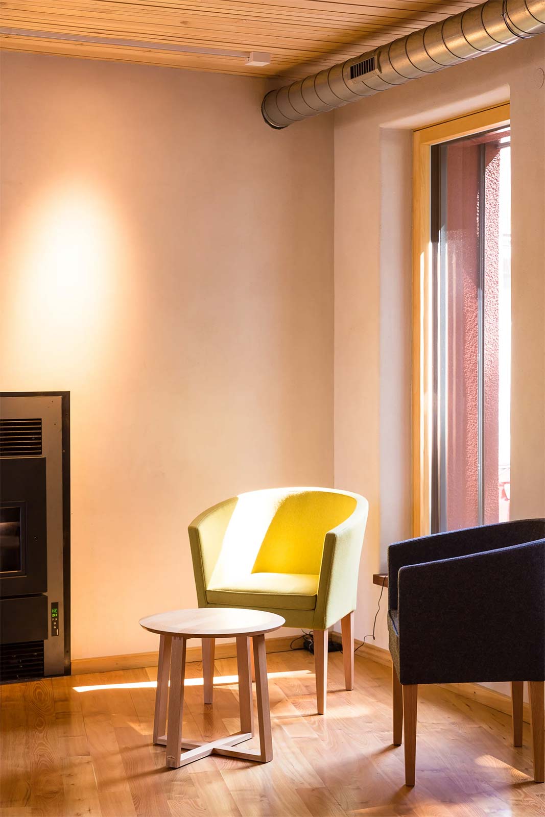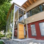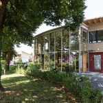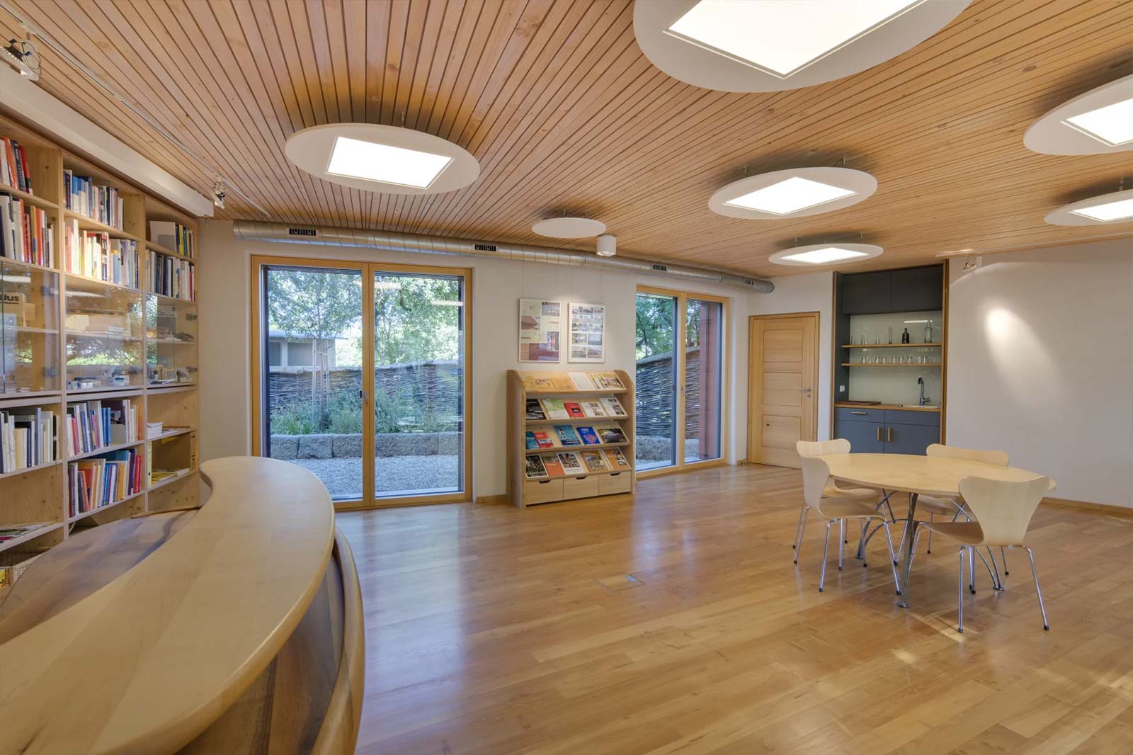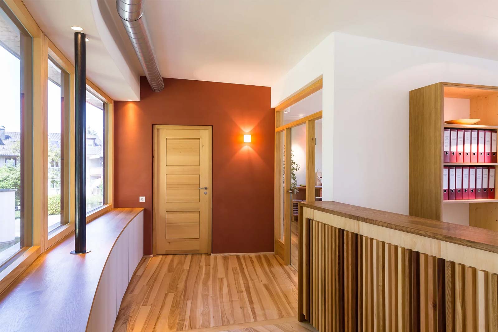 Sitz des Instituts für Baubiologie + Nachhaltigkeit (IBN) in Rosenheim. Ein vorhandener eingeschossiger, geschwungen-kreisförmiger Bau in Massivbauweise (ehemaliger Lebensmittelladen „Konsum“, Baujahr 1955) wurde umfassend saniert und durch ein Obergeschoss in Holzbauweise und ein verglastes Treppenhaus ergänzt. Dabei wurde besonderer Wert auf die Wiederbelebung des architektonischen Charmes der 1950er-Jahre gelegt. Ebenso auf die maßstäbliche Einbindung in die Umgebung, den Erhalt der großen Laubbäume und ein energiesparendes, nachhaltiges Gesamtkonzept.