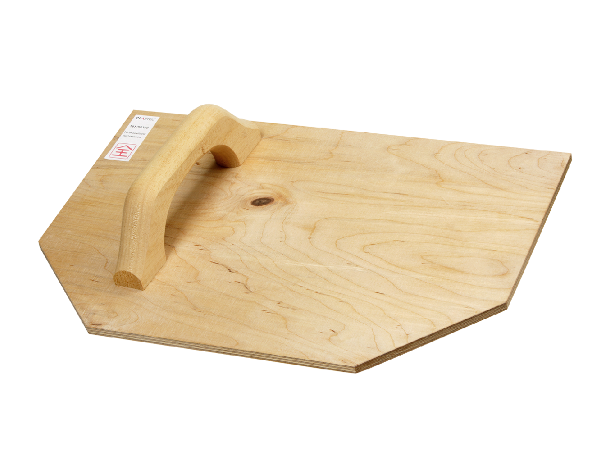 Birkenschichtholz geölt, Dicke 9 mm. Griff-Durchmesser ca. 30 mm. Vom Putzmörtelbrett werden Lehm- und Kalkputzportionen unmittelbar auf Putzflächen aufgezogen. Wichtiges Ergänzungs-Werkzeug bei Verwendung von Unterputz- und Feinputzkellen, unverzichtbar beim Verputz von Decken und Dachschrägen. Robuster Handgriff an der Unterseite (Bild) für bequemes Halten und Tragen in der Armbeuge.