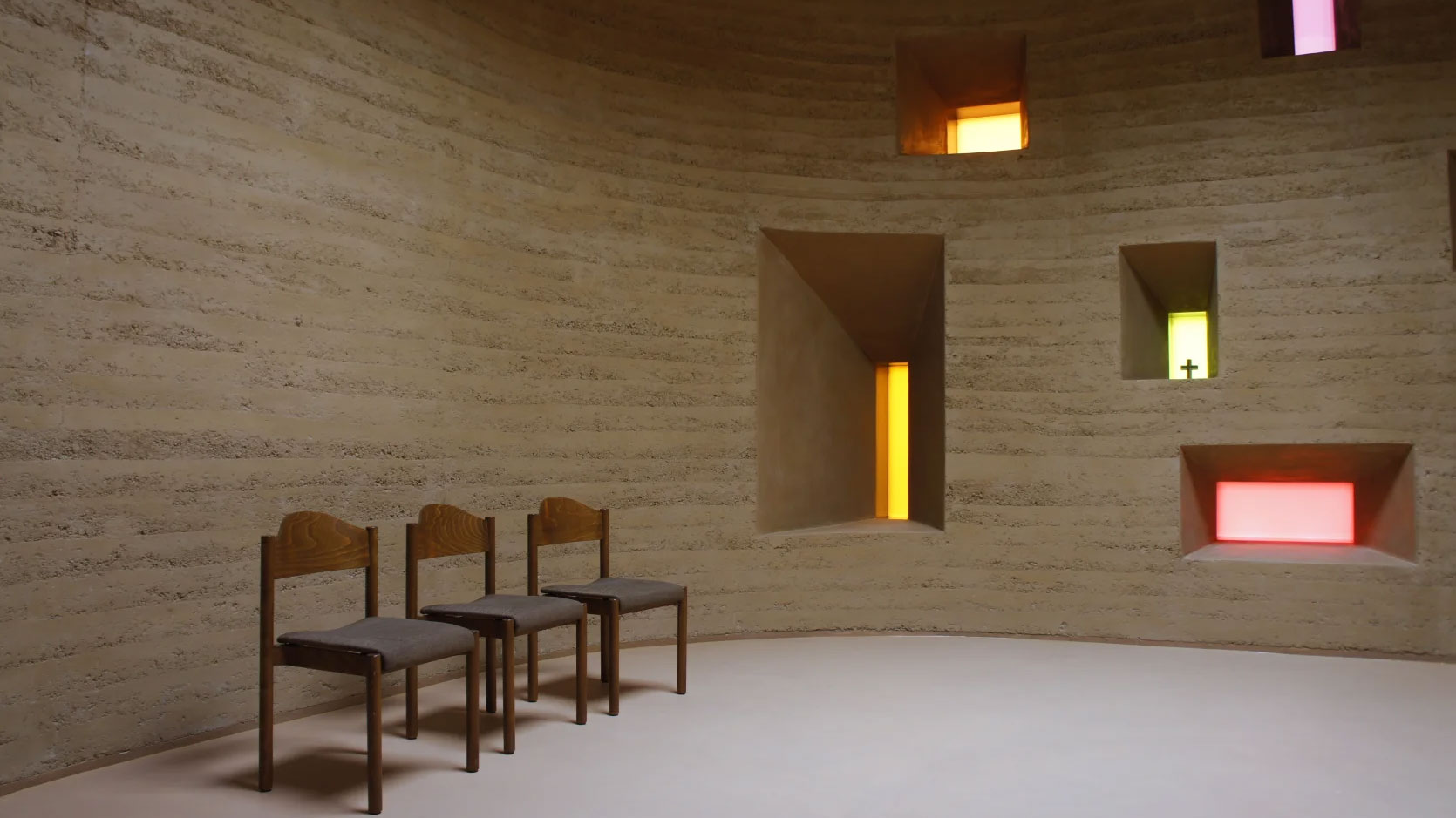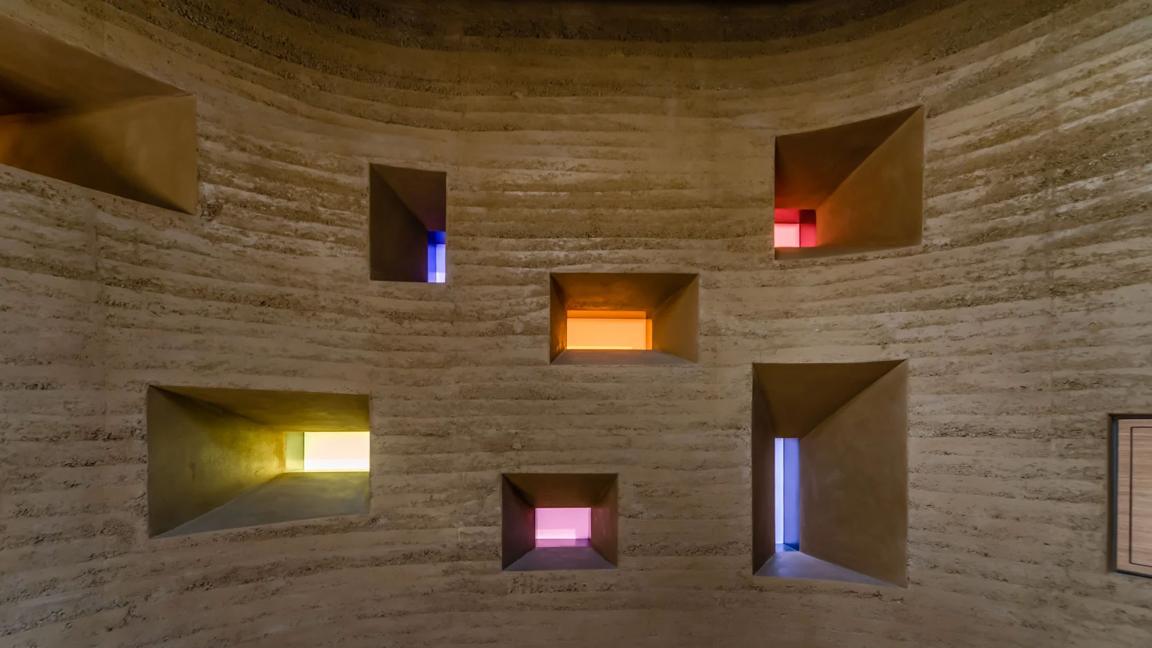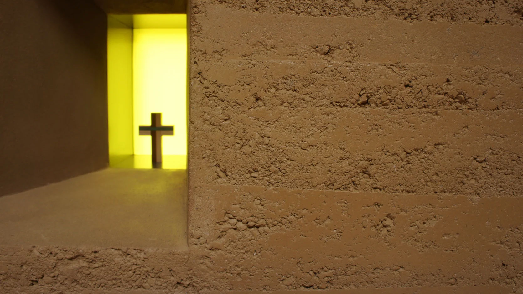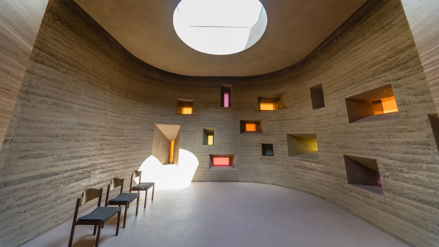 Der fertige Raum beeindruckt durch seine Atmosphäre. Tageslicht in zwei Varianten lässt die Stampflehmwände leuchten: durch farbig verglaste Fensteröffnungen und durch ein kreisförmiges Oberlicht, das den Blick auf die Spitze des unmittelbar benachbarten Kirchturms freigibt.