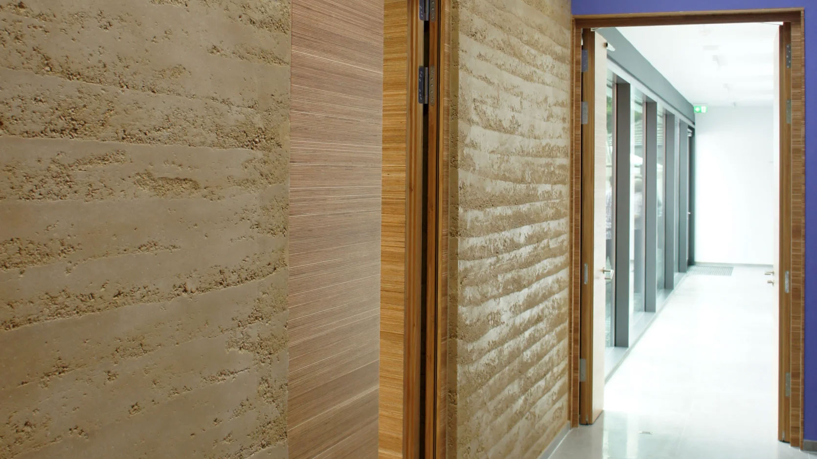 Das Handwerksunternehmen Lehmbau Glück aus dem Schwarzwald führte die anspruchsvollen Lehmbau-Arbeiten durch. Der halbovale Grundriss in Verbindung mit stark variierenden Wandstärken und konisch geschnittenen Fensteröffnungen stellten höchste Anforderungen an Statik und Konstruktion. Die entsprechende Fachplanung führte das Berliner Planungsbüro Ziegert | Roswag | Seiler Architekten Ingenieure durch. Erstmals kam ein von Firma Glück speziell für diesen Auftrag entwickeltes wiederverwendbares Schalungssystem zum Einsatz. Insgesamt wurden hier 68 Tonnen CLAYTEC-Stampflehm verbaut.