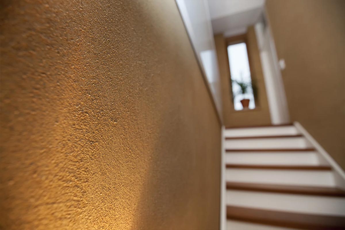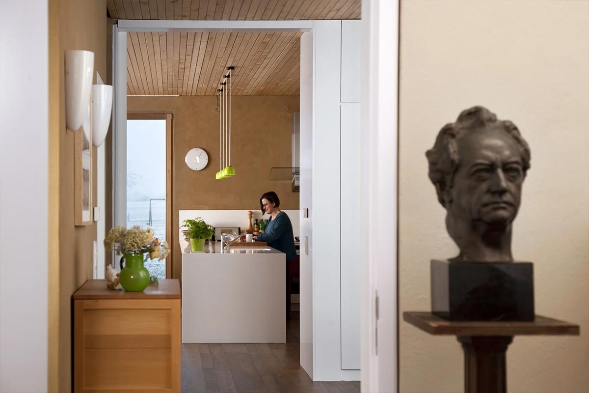„Das Phänomen der Schimmel- und Feuchtigkeitsprobleme im Niedrigenergiehaus ist dadurch ausgeschlossen, erklärt der ebenfalls an der Planung beteiligte Architekt Eike Roswag. Das Gebäude funktioniert ohne technische Spielereien und bietet stattdessen viel gesunden Lehmkomfort. Die Innenraumwände wurden mit CLAYTEC Lehm-Oberputz gestaltet.
