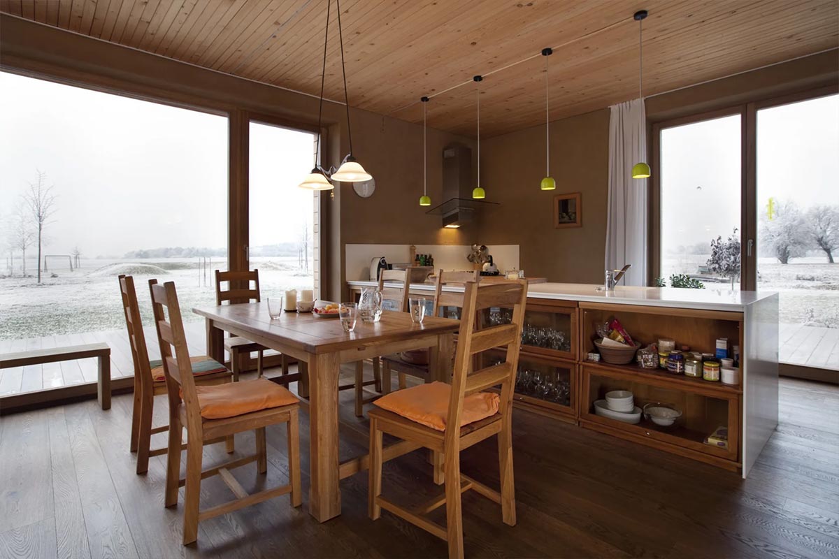Das Haus in Reichenow ist nach Süden ausgerichtet und nutzt die Sonne so optimal – passiv in den Wohnräumen wie auch aktiv mit Warmwasserkollektoren. Die Fenster mit Dreifachverglasung gewährleisten guten Wärmeschutz, ebenso wie die hochwirksame Zellulose-Wanddämmung. Sie ist die passende Ergänzung zum Konstruktionsmaterial Holz und zu den Lehmelementen im Wandaufbau. All diese Maßnahmen sorgen für ein Wohnklima, das zu jeder Jahreszeit angenehm ist.